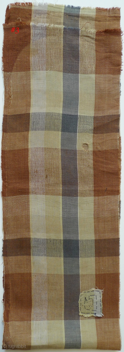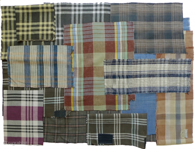 Group of 12 Japanese Plaids. Bought in Japan in the 1970s from a boroichi's warehouse - were old then. Good for patching. Assorted sizes and conditions - some with holes and patches. #1 17" x 14" selvedge to selvedge; #2 17" x 7" one selvedge; #3 42" x 7" one selvedge (shown folded in half); #4 8" x 11" no selvedge; #5 23" x 14" selvedge to selvedge. m