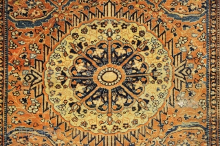 antique tabriz rug. Local find. Genuine older tabriz with a rare terrific design and characteristic early colors. Fine weave. As found, good even tight pile with a few small spots of wear and minor edge roughness as shown. Recent good wash. Hard to find fresh anymore. ca. 1900? 4'5" x 6'2"