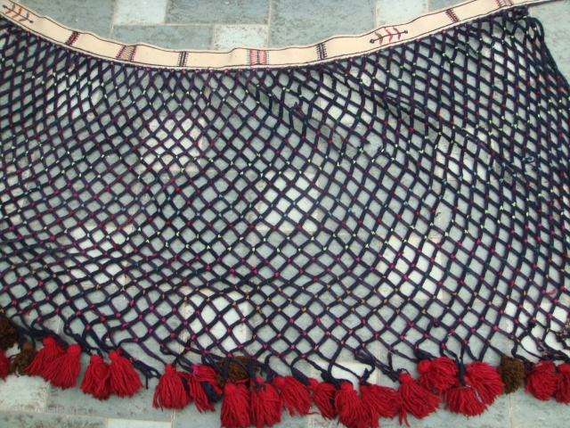 Late 19thCentury, "Saryk" Turkmen tent trapping from n.w. Persia. White Cotton band with Woolen mesh (black) sewn to one side. Woolen baubles knotted to the ends of the mesh. Used for decoration and, at times, has the "Qashoqdan" (Spoon Bag) stitched onto its woolen mesh, thus serving a functional as well as a decorative purpose.