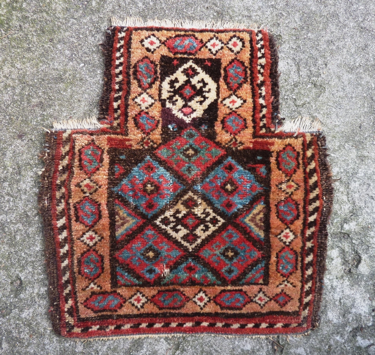Kurdish Salt Bag front, ca. 1900, 42/28 x 39 cm. All natural dyes. One small damage ( see last two picts.)