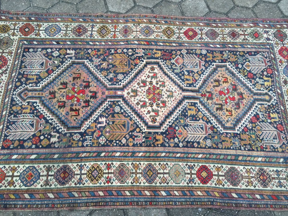 Antique Shekarlu Qashqai tribal rug from Southwest-Persia with lots of birds and animals, age: circa 1900. size: ca. 235x135cm / 7'7''ft x 4'4''ft www.najib.de