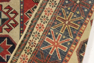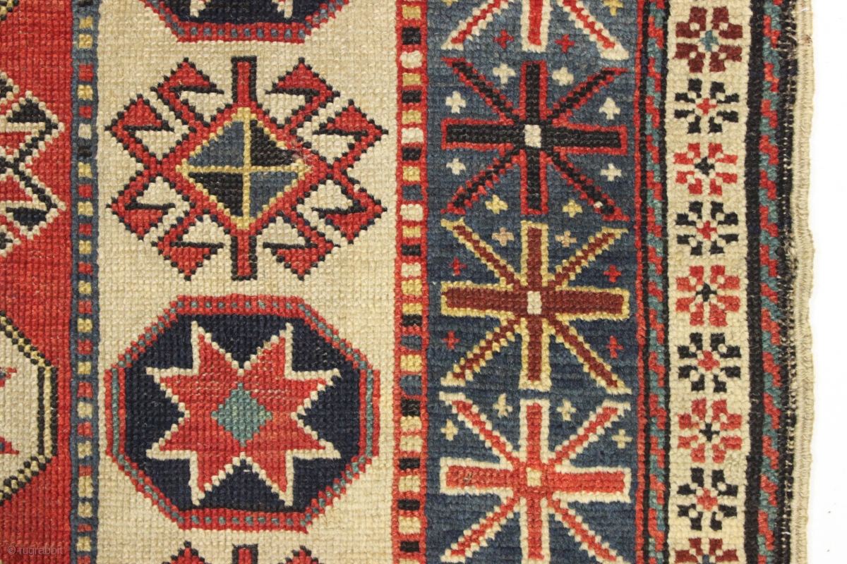 antique caucasian prayer rug with an unusual and interesting design. Eye catching large red hands and big scale columnar, totemic field. All natural colors. As found, with overall mostly even low pile, original selvages, and good ends. Appears to be in need of a good wash. i see two or three small thumbprint sized old holes, easily repaired. i see no repairs. Fresh New England find, probably east caucasian shirvan. Good age, ca. 1875 or earlier. 2'11" x 5'10"
