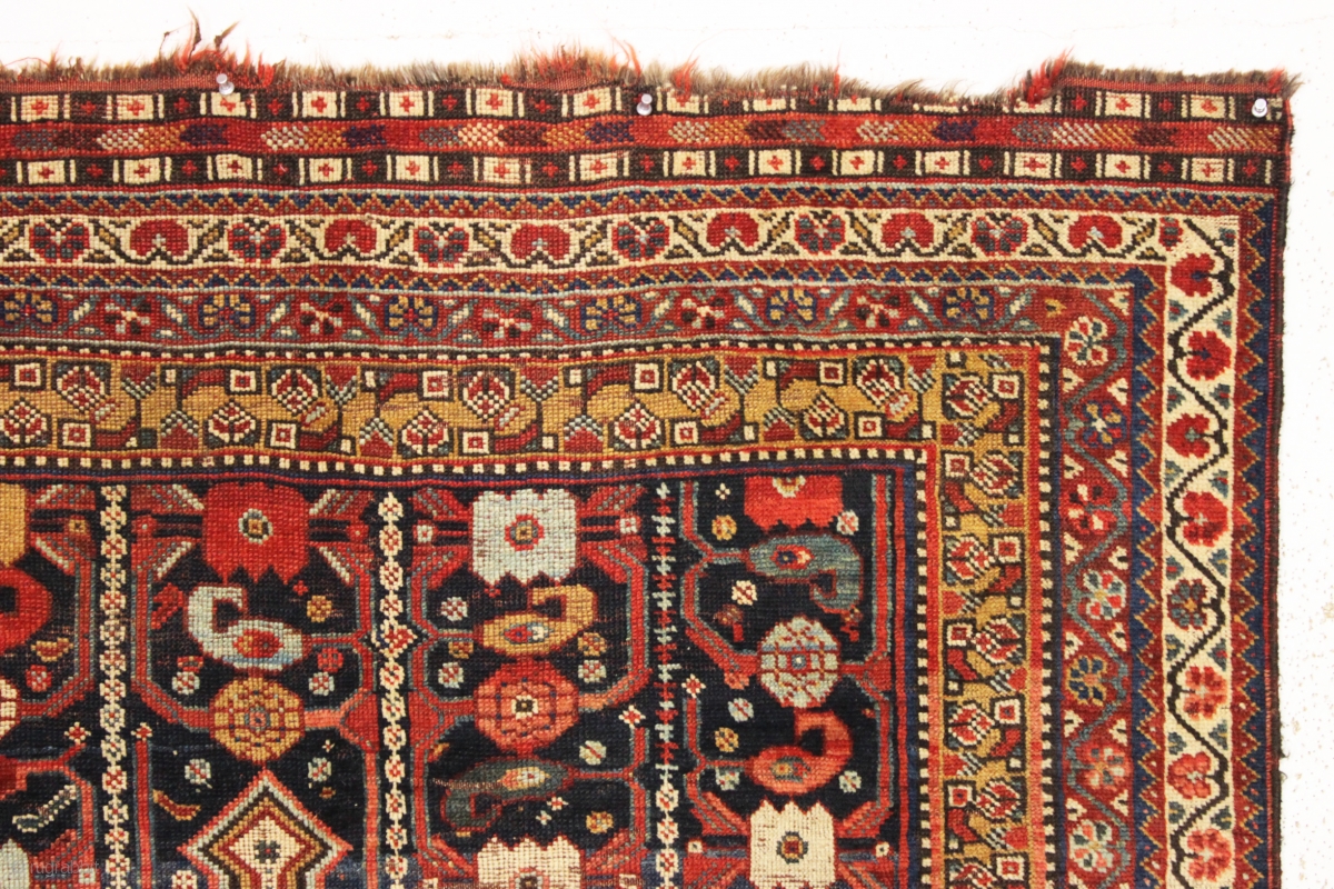 antique little south persian rug in good condition with a very interesting design. An unusual combination of allover field elements and a dramatic ivory medallion. All well saturated natural colors and good wool. Overall good condition with scattered light wear as shown. Original selvages. Reasonably clean and i see no repairs. Good age, ca. 1880 or earlier. 4'3" x 6'