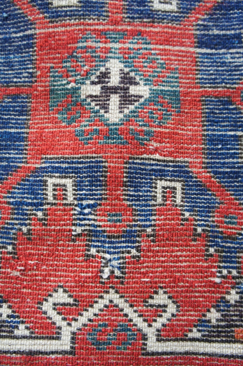 3rd q. 19th c. Gelveri yastic. 20" x 40". Saturated natural colors with thick pile. Indigo blues stand slightly higher than surrounding reds. 2" wide old green cloth binding tape sewn across the ends on the back. It has well articulated details on the edge of the medallion including abundant white pearls along the outer edge and bold white junctions of the lotus leaves of the medallion. Minor defects at best;see photos. a superior example. $ 25 shipping any where in the lower 48 states. Checks preferred.