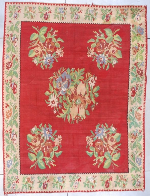 This circa 1930 Bessarabian Kilim measures 8’7” x 11’3” (265 x 344 cm). It has a tomato red ground with five huge bouquets of flowers in green, Wedgewood blue, cordovan and tobacco with a wide light colored border with a similar motif as in the field. The rug shows staining in the field which may come out with a cleaning although i don’t know nor will i guarantee that. Otherwise, this rug is in good condition. The buyer pays the shipping with insurance of $50.