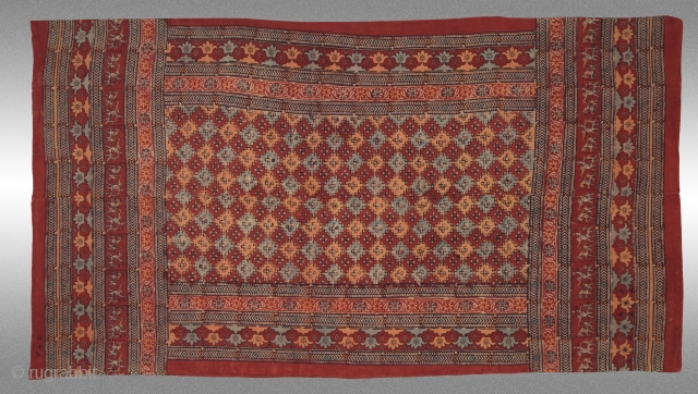 NOTE: Probably block printed in Jaipur with traditional colors and designs on heavy rezi fabric. This khola may have been constructed in Jodhpur. The rows of horses and elephants with riders produce a relaxed tone amidst the flowers, creepers and geometrical patterns.