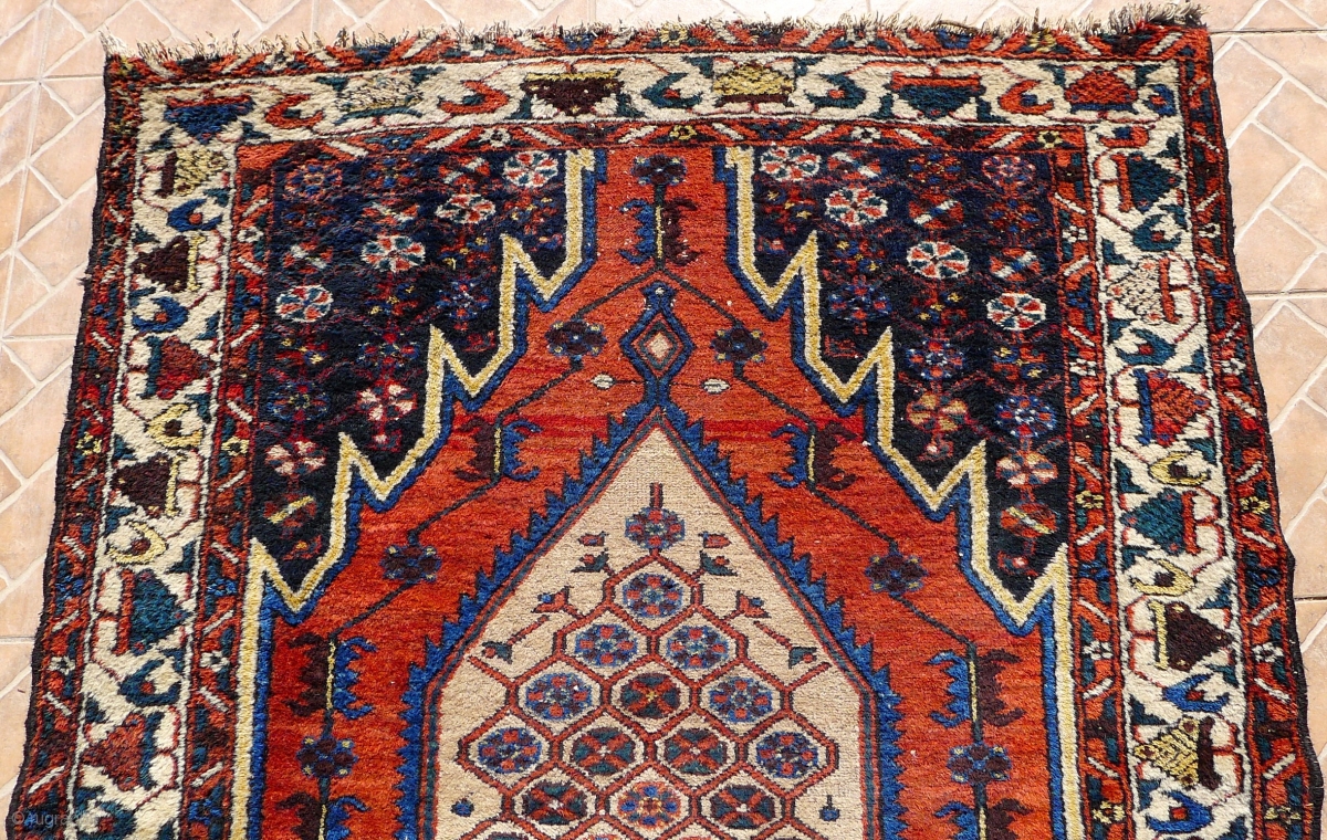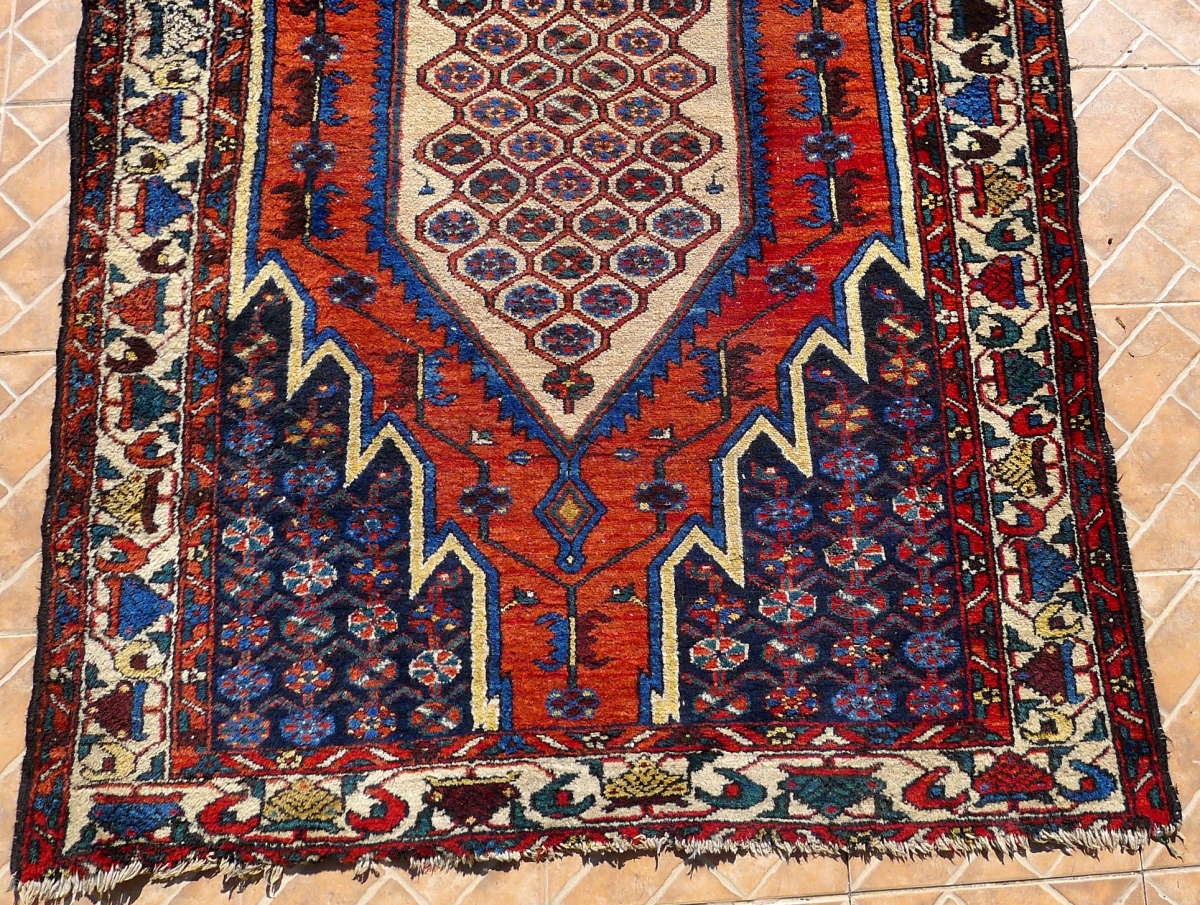 Very decorative piece with central honeycomb design and all the right colors incl. an abrashed madder-red field and soft yellow. Attractive white-ground tree border. In very good condition with only some slight central wear. Horizontal ends need securing.