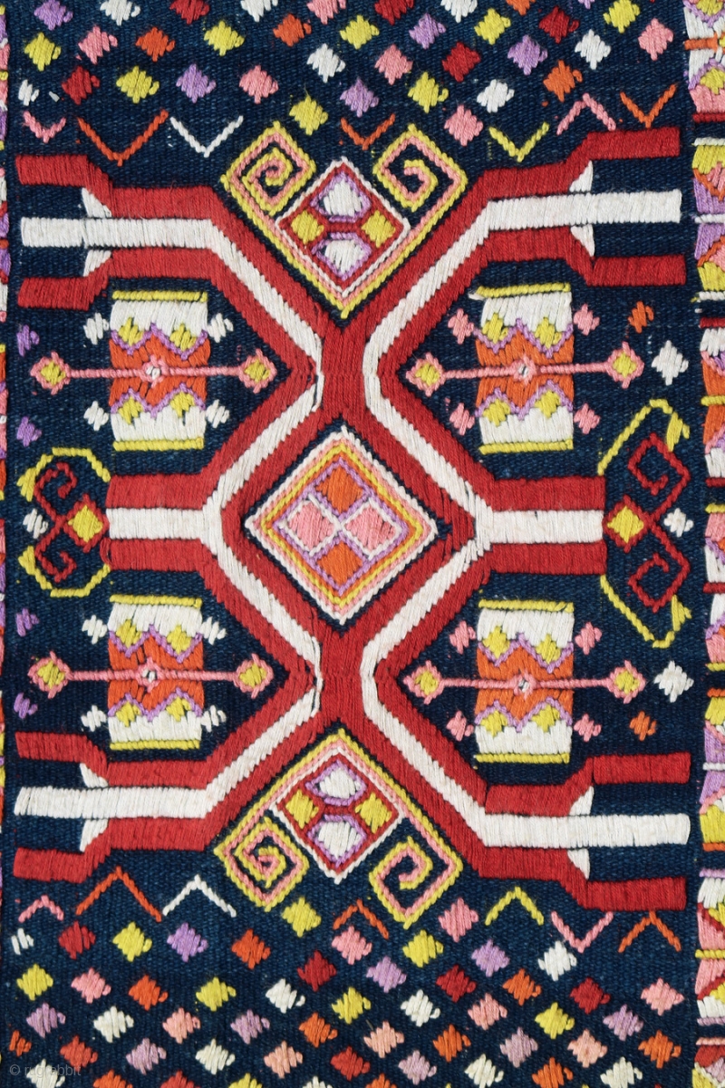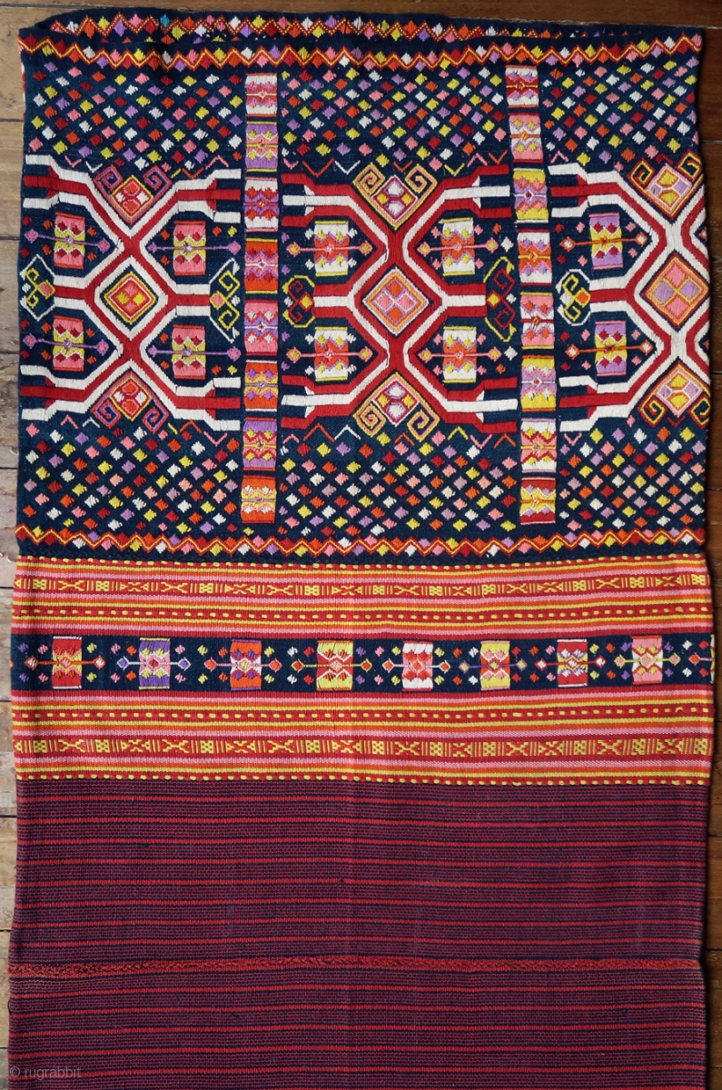 Condition: Excellent, with no stains, holes or tears. The skirt has an extremely fresh appearance, and seems to have been kept carefully as a special piece and rarely used. The natural indigo base is a rich deep color, and has a nubbly, closely woven texture. The supplementary colors are all vivid and clear.