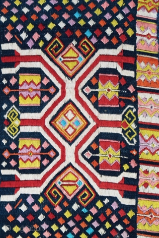 The main figure with outspread legs adapts old motifs with spindly, stepped legs found on 19th c skirts from Belu, especially Malaka (adjacent to Ayotupas). It has a stronger, more dramatic effect than the typical water-bugs illustrated on most Ayotupas skirts. This is the only instance of this bold, graphic style of expressing the old anthropomorphic figure that i have come across.