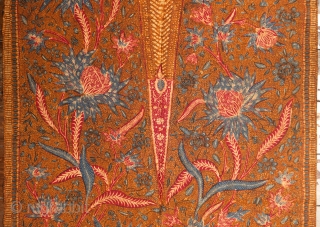 The intention of the genre was to combine the best of the different regional styles of batik. Tiga negeri batik was the most expensive batik of its time: whilst the entrepreneurs may have saved costs by getting the background made in central Java, where batik labor was cheaper, the coordination and transport required also multiplied costs. As a luxury item that declared one’s status, tiga negeri batik was worn by wealthy Peranakans who wished to show their affiliations with traditional Javanese culture, and was also favored as informal private wear in the central Javanese courts. Its cosmopolitanism had the inadvertent effect of making the batik styles of one region familiar in another, leading to the greater sharing of motifs. The format of this breastcloth with a central reserved section is one of the oldest types of ceremonial ritual court batik; at the same time, it incorporates the colors and finely detailed floral motifs typical of the north coast, in a multidirectional design that pre-dates the bouquets introduced by Indo-European batik-makers, and imitates the scattering of blossoms in ritual.