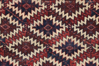 antique nascent or fragmentary turkoman asmalyk with an unusual border. Appears to have all natural dyes and an interesting and unusual palette. Various old small crude repairs and of course the big one, making it rectangular and useful. Reasonably clean. Soft and floppy handle. Good age, 19th c. Don't miss this rare latent asmalyk. 22" x 46"