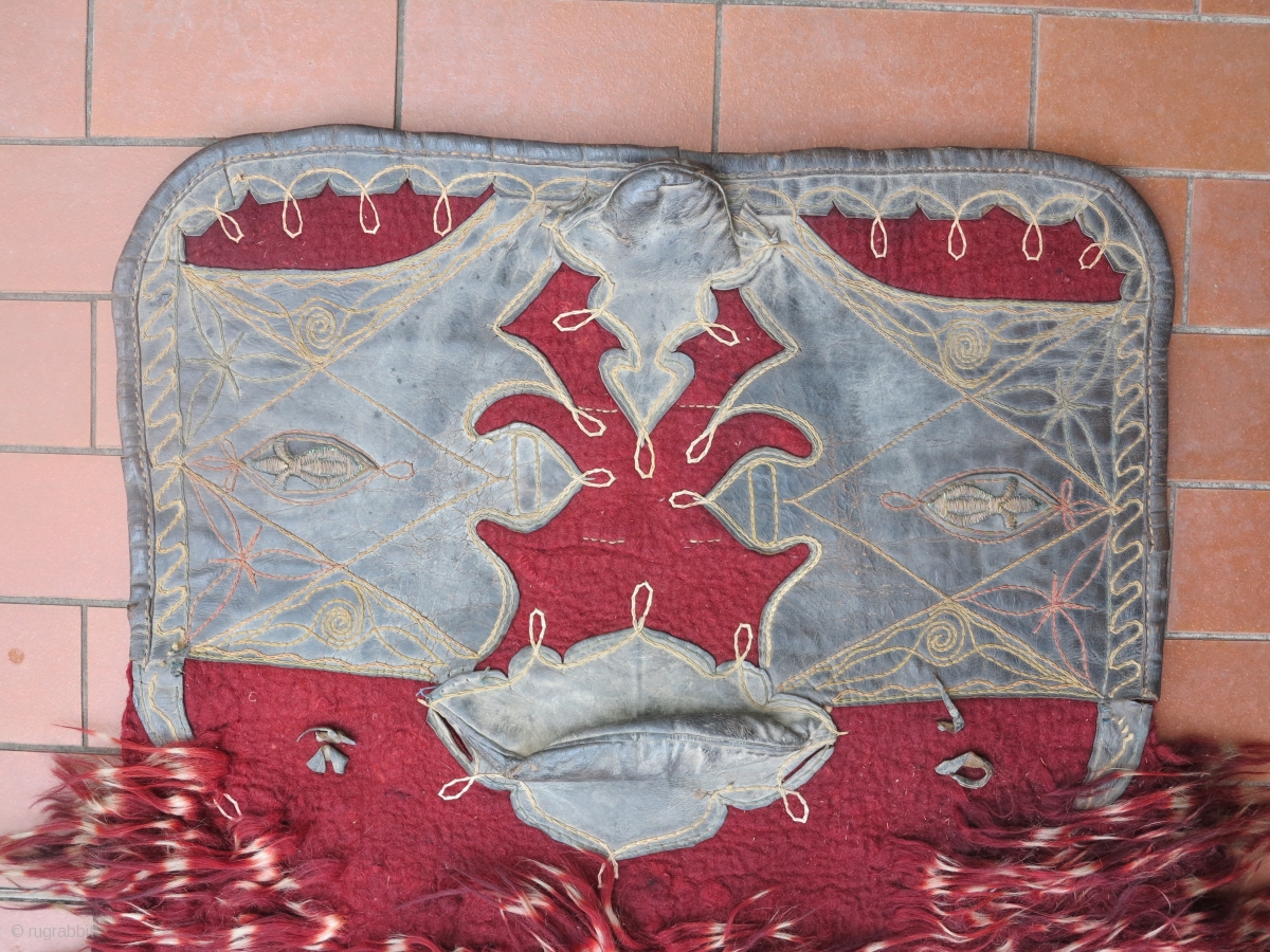 Turkish saddle with leather and metal thread decoration and felt on back. Unknow origine of the pile. Very collectible piece. sold