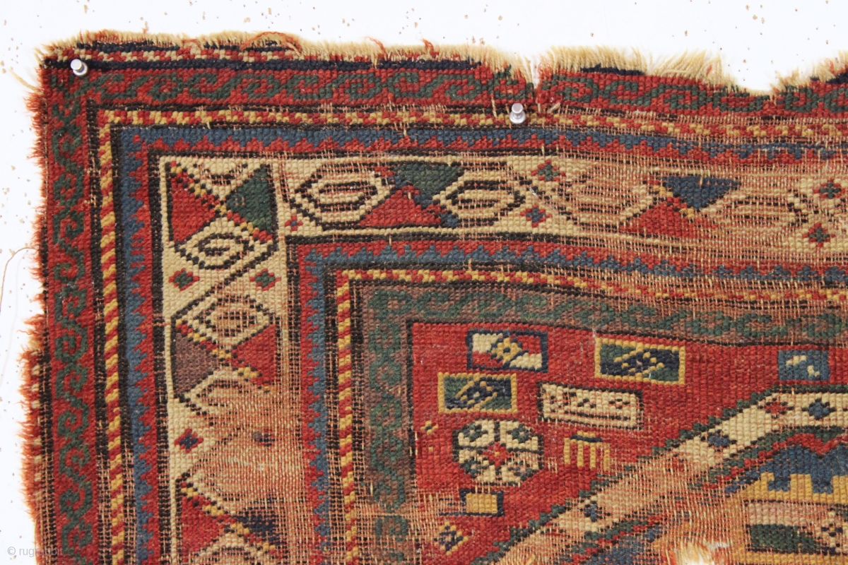 early kazak prayer rug with an unusual mihrab and a very attractive main border. As found, very, very dirty with low pile and scattered damage a shown. Unclear inscribed date. All good natural colors including a fine old purple. Not for restoration but appreciation. Old. 3'3" x 4'10"