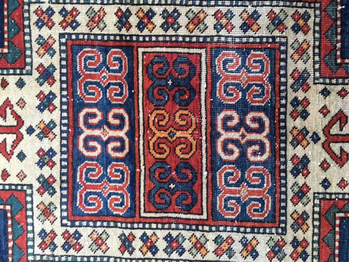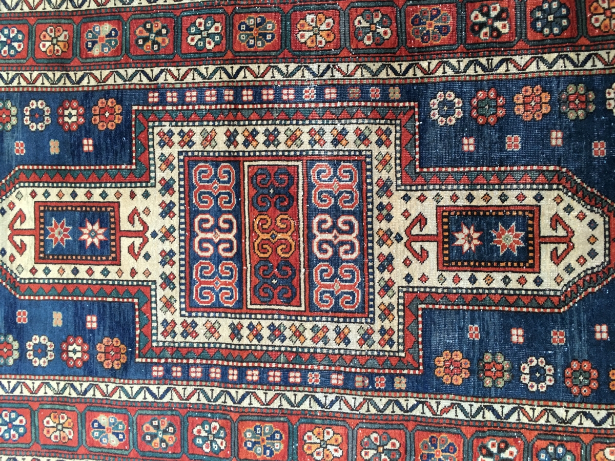 Antique Sewan Kazak Rug. Early 20th Century, 1910-1920. Lovely all organic colors including a natural orange and nice greens and blues. Original side cords and ends. Size 88"x 45"/223 x 114cm. Good pile with some lower areas around center. Thick but soft handle. Washed.