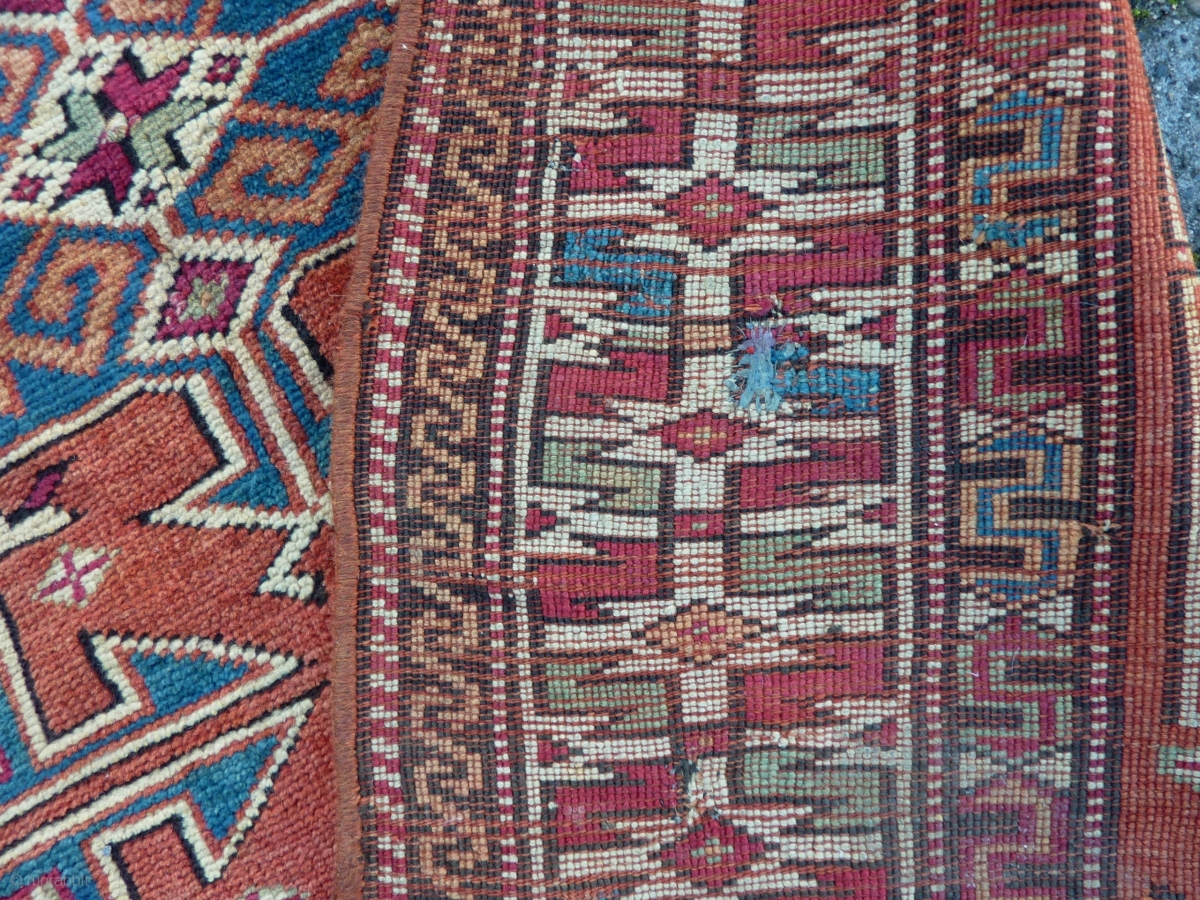 Bergama, 134 x 114 cm., 4' 5" x 3' 9", mid 19th c., with lots of cochenille in the border. Nice positive-negative reciprocity. Sides redone, two little holes, one tiny repair. No other repairs. Washed.