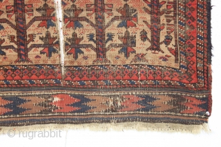 antique little camel ground baluch rug with tree elements and some unusual red dotting. I've never seen this before. Unfortunately this rug ran into a buzz saw and is nearly cut in two. Priced accordingly. All natural colors featuring a nice ember red. Not backed or restored. Has some presence. ca. 1875. 2'8" x 4'
