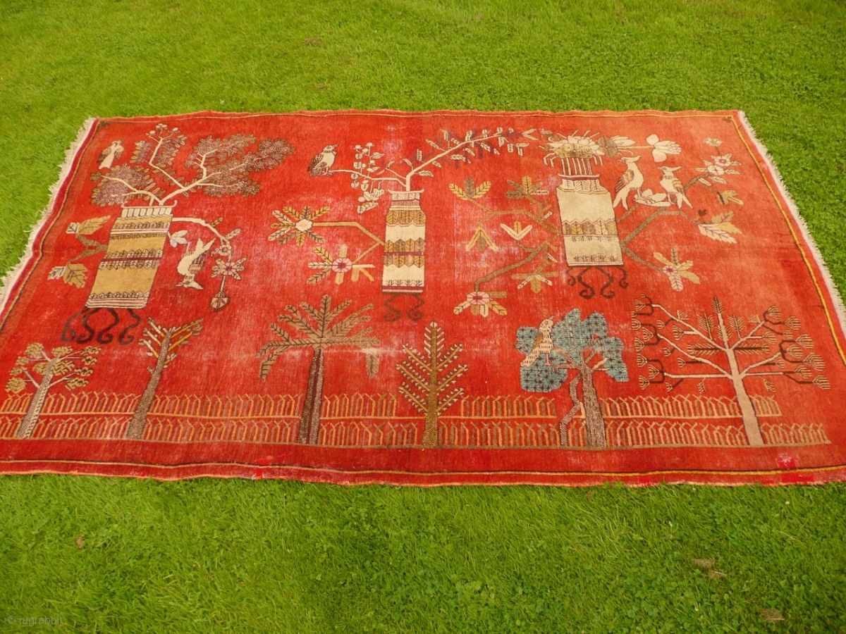Charming 1930's Khotan 'landscape' rug decorated with trees, vases and birds - convincing enough to make a cat curious (see image 5). Condition, some areas of wear and old moth damage but generally good and has been cleaned. Size: 9'.2" x 5'.10"