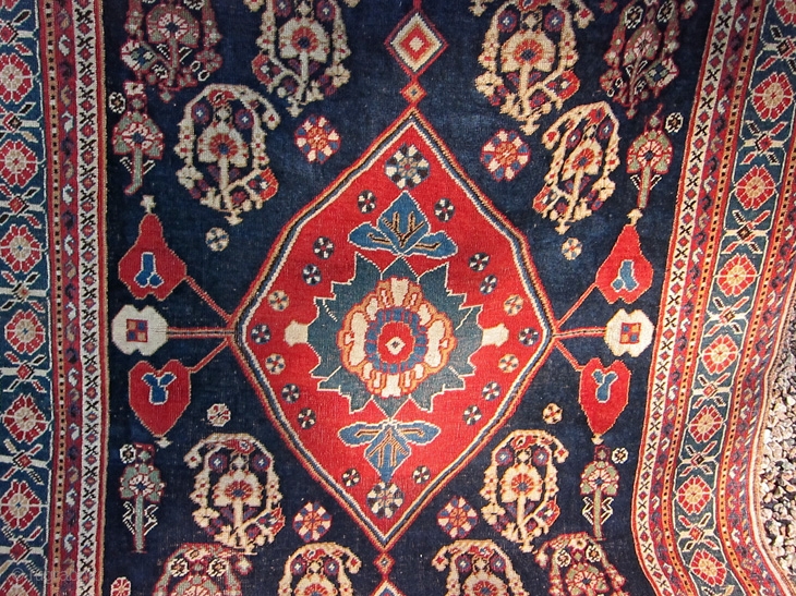 Small Qashqai, possibly Kashkuli subtribe, very fine and exquisite weaving, 155 x 105 cm. All original with just a little wear to the selvages, dark blue ground, 1860-1870. All good magnificient colours! Rare item.