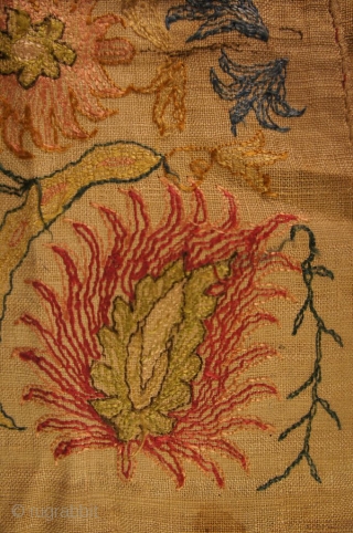 19th c. Anatolian(?) textile. 14 1/2' x 16 1/2'; silk on linen. Side edges as woven with top and bottom with a finished fold. Some blacks corroded; stain in lower right with two tiny burn holes along bottom edge. Photo image is a bit washed out. All colors are robust with nothing faded. Price includes shipping anywhere in lower 48 states.