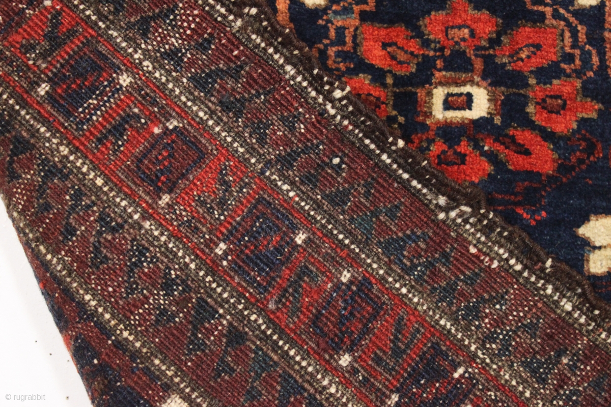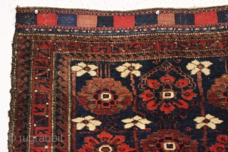 antique large baluch bagface with an older and very beautiful blue ground mina khani field. In full thick pile, nearly original, with no repairs. Appears to have an unusual single wefted structure. All natural colors. a rare piece for the astute collector. Good age, ca. 1875 or earlier. 30" x 35"