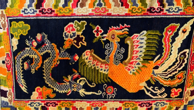 The rug is made from pure Tibetan highland sheep's wool (called changpel) and depicts an intricate design showing a flying dragon and phoenix within a traditional, multi-coloured, cloud-patterned border. The phoenix (arguably the highlight of this rug) is beautifully woven with exceptional details including it's extravagant flowing plume, feathered wings and exquisite head and feet. There is also a delicate flower clasped between it's beak.The dragon is shown playing with a wish-fulfilling pearl (which represents wisdom and health).