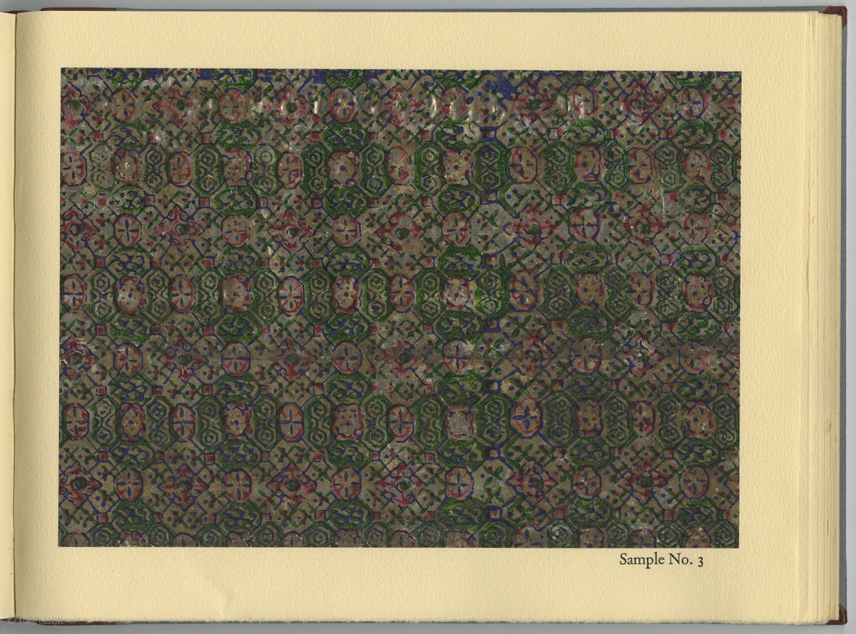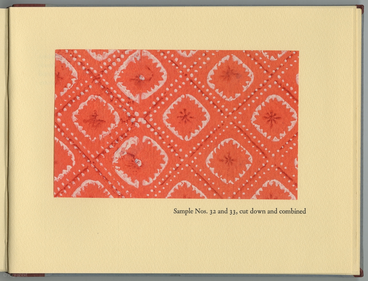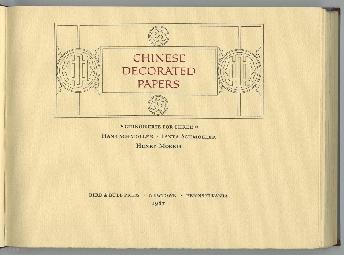 Chinese Decorated Papers: Chinoiserie for Three. Bird & Bull Press, Newtown, Pennsylvania. 1987. a beautiful hand-made book from a fine private press. Very good condition. 8" x 10". Red leather spine and tips; covers of hand-made paper over boards; green leather embossed gold title on spine; embossed gold design on cover. This is copy 84 of 325 copies. Includes 23 actual samples of Chinese "tea-chest" papers - each sample 6" x 8.5" (some are gilt); 68 pages of fascinating text, including how the papers were made and letters between the authors and the printer; 6 black/white photographs of the papers being prepared for inclusion in the books; price lists from the Japan Paper Company, New York, 1926 that list among other types of papers "Nanking Papers". These samples were imported from Foshan, China in the 1930s by the Englishman Walter f. Crtttall (1887-1956) to use as wallpaper in his house in Essex. They were found by the authors, Hans and Tanya Schmoller, "lovingly kept" by Crittall's widow. Hans Peter Schmoller (1916-1985) was a well-respected book designer. He designed covers at The Curwen Press in London and Penguin Books where he was the Head of Production. The publisher, Henry Morris founded the Bird & Bull Press in 1958, one of America's oldest private presses. As Morris said, "It pleases me to know that without the Bird & Bull, many books on worthwhile, albeit esoteric subjects would probably never have been published." To see more books and textiles from my collection please go to www.susanmeller.com