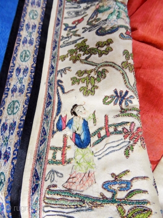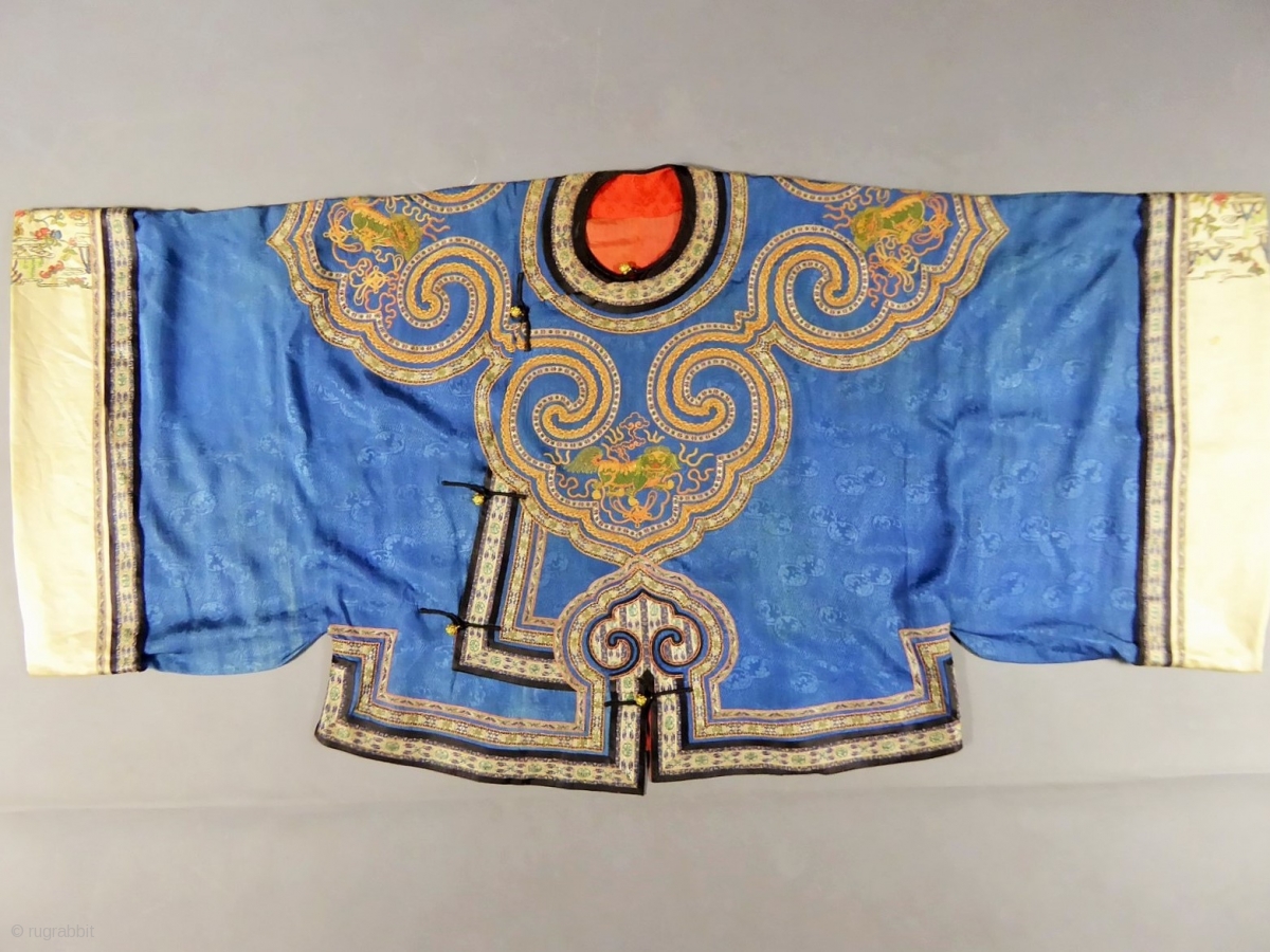 Informal chinese jacket for women - 19c Qing Dynasty. With lion's badges. Excellent condition except dicret water halo on the blue silk and light spots on cream silk handles. Hight 63 cm, width 133 cm.