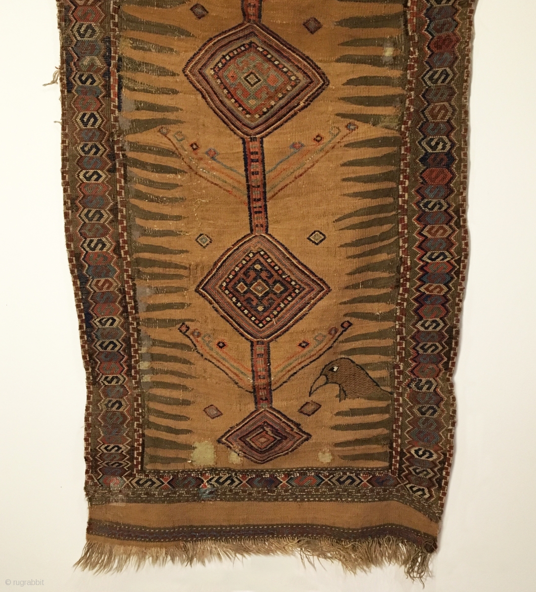 Early Afshar Sofreh Flatweave. Outstanding example. Condition: Very good considering age, small old rewoven areas in field, all original, old velcro strip on top for wall hanging. 9 colors. 69 x 25in. Delicately hand washed.