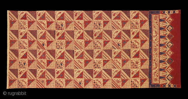 1940s Kain Panjang Batik Tulis/Cap, long cloth hip wrapper, cotton with hand drawn and hand block printed wax resist pattern of small tampals or triangular patchwork design. Natural dyes, Java people, North Coast Java for export for the Malay people in South Sumatra. Indonesia.
