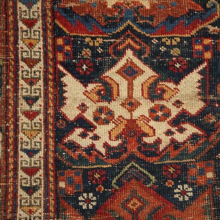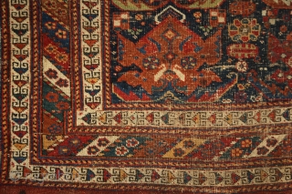 Afshar 'shield/palmettes/flame' rug, wool on wool, 1,68 x 1,23 m. Real, precommercial, tribal piece from the 2nd half of 19th century, worn allover, but still has a shining charisma and fresh organic colors. Please take a look at the other reasonable offers here: http://rugrabbit.com/profile/5160