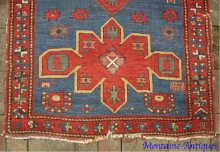 Kazak-- 3.4 x 6 ft 1 in. Interesting and decorative 19th cent. Obvious condition issues. Please call for condition Report. $20 ups to lower 48. Check out fresh posts on our web site: http://www.montaine-antiques.com/oriental-rugs/