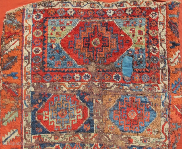 East Anatolian Kurdish Rug with Memling Guls. Probably 18th century with a rich, diverse and moody color palette, exceptional wool and dramatic drawing. Worn and fragmented but gorgeous, mounted and conserved. Has a great presence and almost ancient aesthetic. size is 3'5"x5'3"
