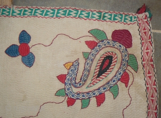Beautiful Extra Large Antique Kantha Quilt. From the West Bengal region of India. 84 x 61 inches. Gorgeous, with fish, flowers and botehs in the corners. For all of the newly acquired kanthas, visit http://banjaratextiles.com/NewKanthas.html
