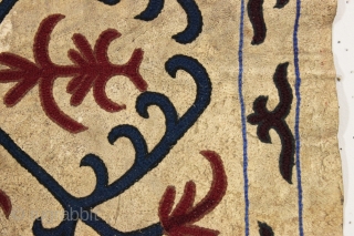 New England attic find. Interesting old decorated animal hide square. Lakai? Uzbek? As found, dirty with some wear as shown. Colors appear all natural. And yes it was really folded up in an attic. 19" x 21"