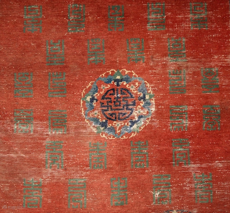 Mytical chinese? monastry carpet, first half of 19th century, absolutely unusual main field full of (probably) longevity "shou" and "fuo" symbols around 5 mystic floating medallion. Exceptionally drawn 3 dimensional swastika border going all around, the symbol of the cyclic sun together with the full moon in the inner border. Note the 3 different blue colors, 3 different greens, and bright brick red field.... Other pieces on sale here: http://rugrabbit.com/profile/5160