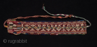 Headband, Bolivia. 16" by 3". Wool, beads. Mid 20th century. Condors, fish and various four-legged beasts are woven into this headband, which is bordered by loops of colorful beads. In good condition, but for a few missing beads.