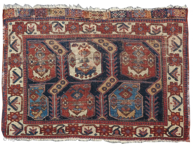 Finely woven with two rows of plump 'boteh' paisleys, this authentic Afshar bag face was one of a pair of fronts of a saddle bag set, or 'khorjin'. Tones of ochre compliment three shades of distinct blue. Colorful flat woven fasteners are preserved at the top. Collection of Mr. and Mrs. John Corwin.