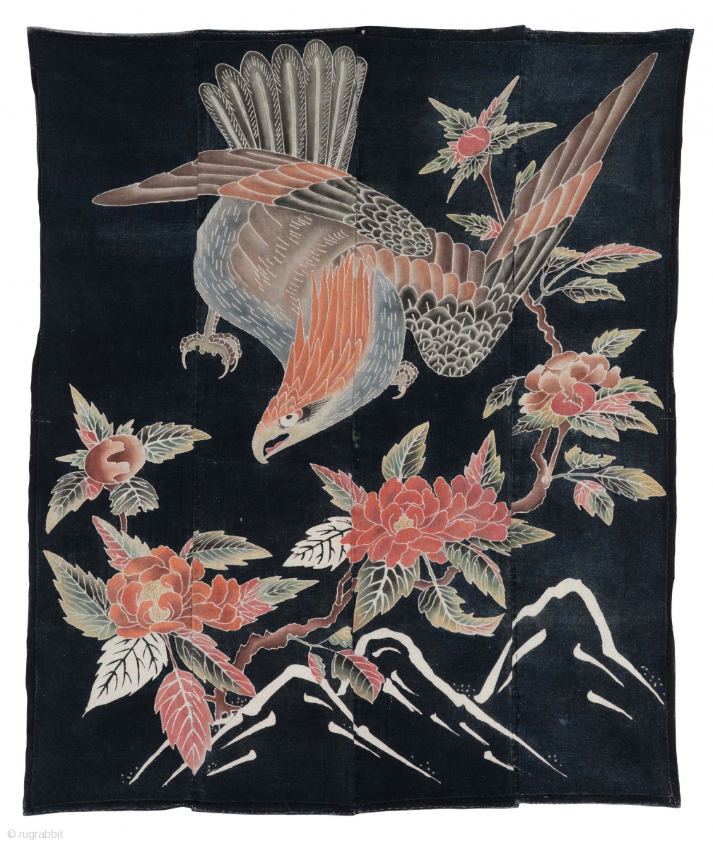 The dark blue shades can take up to thirty baths in colour, and it should be noted how after each bath the indigo should be oxidized, and then several hours have to be spent between a bath and the other. All this makes us understand which skills out of the ordinary is required to get excellent results like this, depicting a falcon in flight among flowering peonies and with mountains in the background: not only the design but also for the quality of the colours and their shades nuanced.