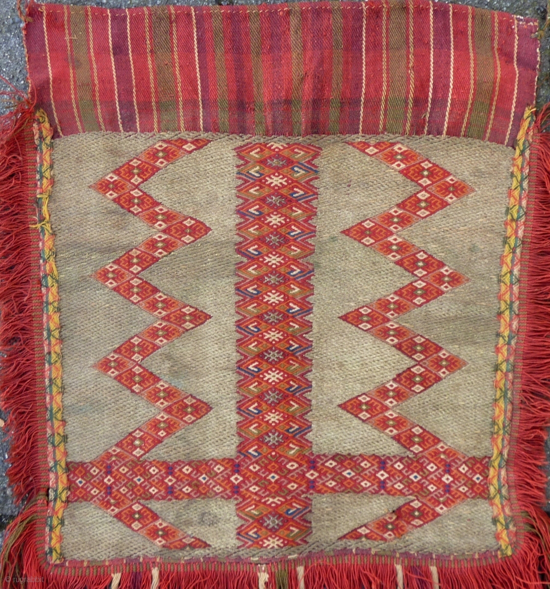 Antique Romanian Apron, ca.1900 ( 'The Met' dates them 19th. c.), 39 x 41 cm., 15" x 16" ( the brocaded part). Wool, cotton whites and silver thread brocading.