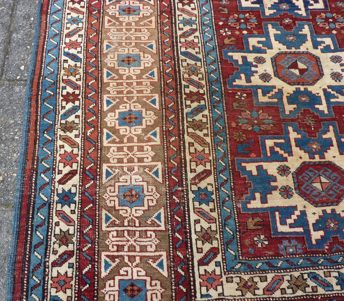 Antique Kuba Lesghi with Kufic border, 204 x 131 cm., 6'8" x 4'4", ca. 1900. Good pile with corroded browns and some scattered wear. In the center three repaired slits and a finger tip seize hole at a secondary border ( see pict. 8 ). Washed.