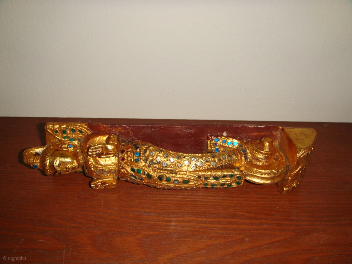 Rare, Antique 19thCentury Burmese Male & Female Guardian Spirit ("Nat") wooden satuettes. Lacquered, Gold-gilt with coloured mirror-glass inlay. Made as handles for a Prayer chamber door and/or cupboard for storing religious articles. Approx. sizes for both statuettes: Height:27cm/ Width:5.5cm/ Depth:5cm. In Excellent condition.