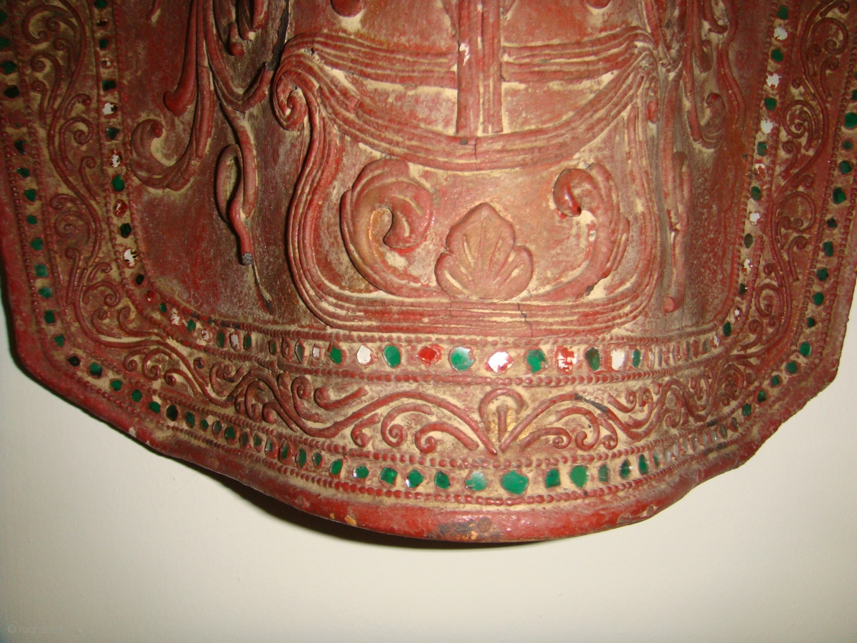 "Nan Yan Kat". An early 19thCentury, wall-mounted, Burmese Quiver. Made of Bamboo strips; Lacquered, with coloured mirror-glass inlay. There is some damage to the "Thayoe" design pattern though the item is still in good condition for its age. Approx. size: Height 46cm/Upper Width 42.5cm/ Lower Width 29cm/ Depth 10.5cm. Rare Collector item.