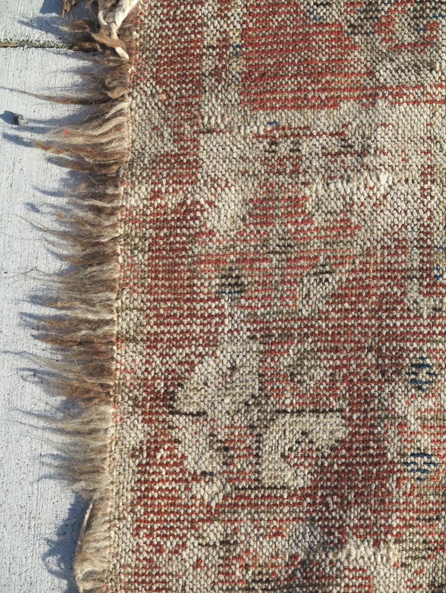 Kirghiz fragment found in Tibet, older than any Kirghiz piece I've seen with an ancient aesthetic. ... It appears to be quite old. Warp is hand spun cotton, and the piece is single wefted with very rustic un-dyed seemingly un-plied? wool. The synak border is preserved on one-side giving it the appearance of an ensi. This is most likely coincidental but still fascinating. Soft blanket-like handle. This is sort of a love it or hate type piece.