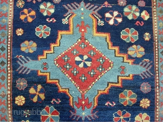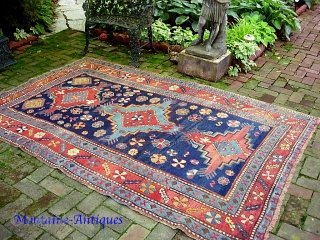 Kazak. 5 ft 2 inch x 8 ft-- Nice larger size. i think circa 1900 Period. Dynamic three medallion design and great colors. a bit of foundation spots-- mainly via brown oxidation. Several other smaller issues. Call me for concise in hand condition report. $25 ups shipping to lower 48.