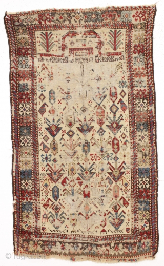 antique akstafa prayer rug. Ghost of a very early example of the type. Extraordinary drawing and colors. Obvious heavy wear and crude old flat stitch repair and priced accordingly. Reasonably clean and structurally sound. An interesting piece for study and contemplation. a ghost, but a friendly one. ca. 1850 or earlier. 3'2" x 5'3"