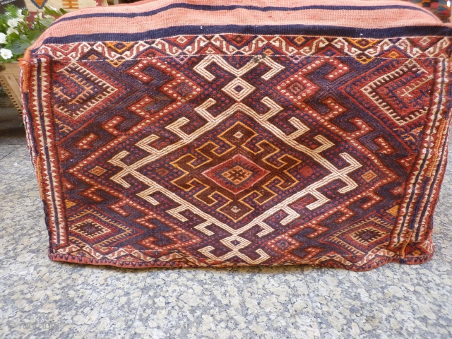 One of a pair of n.w. Iran, Azeri Mafrash, 53cm high x 43cm wide x 93cm long, earthy colours, extra warp wrapping motifs, good original condition including intricate edge binding. Ideal for a bench seat or as an impressive storage bag for that collection you are building up.