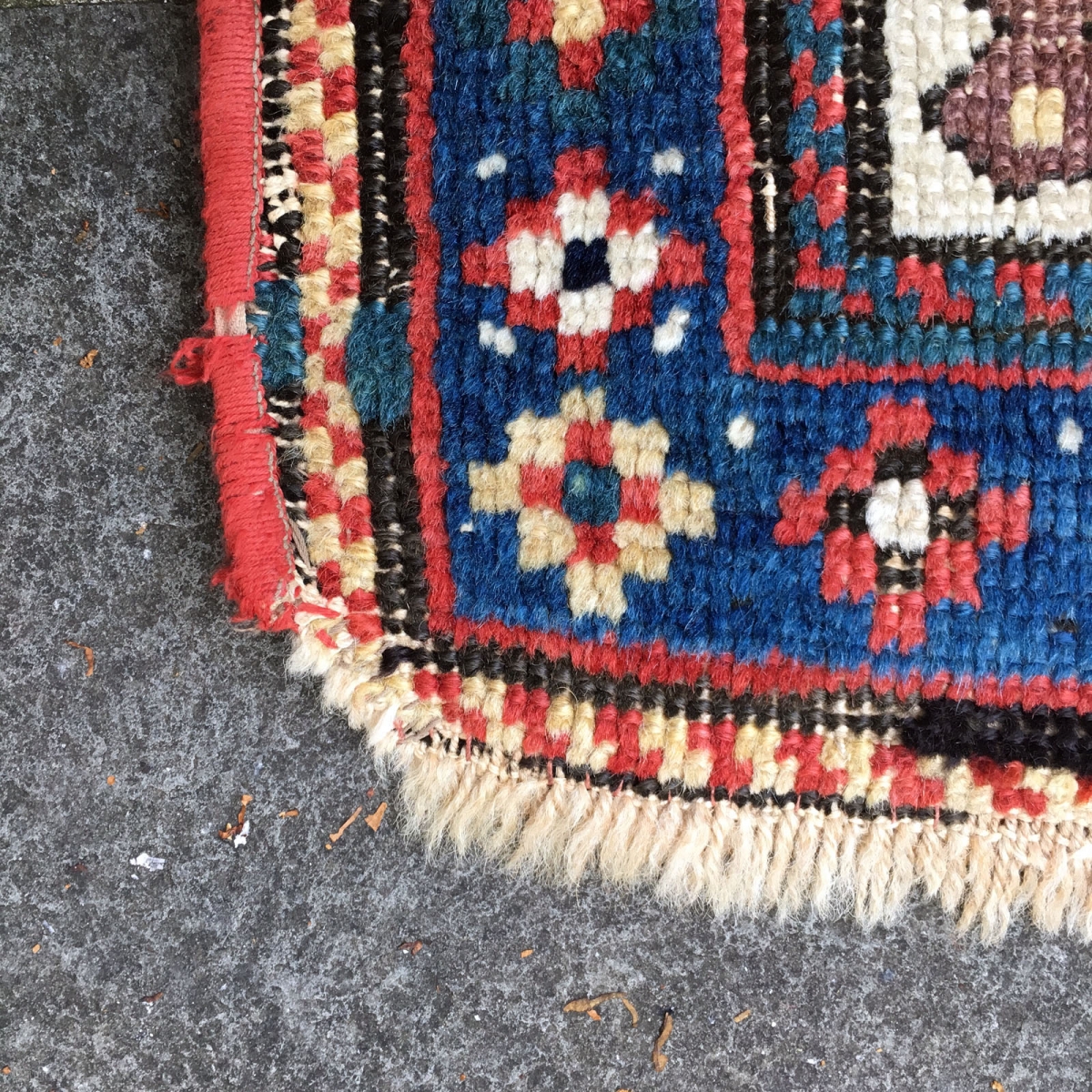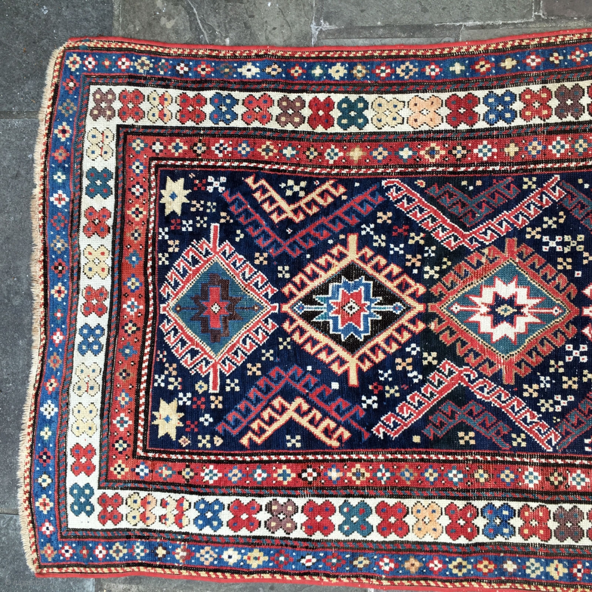 KAzak Shulaver, low pile, original ends, borders redone many years ago, some repiling, late 19th Century.