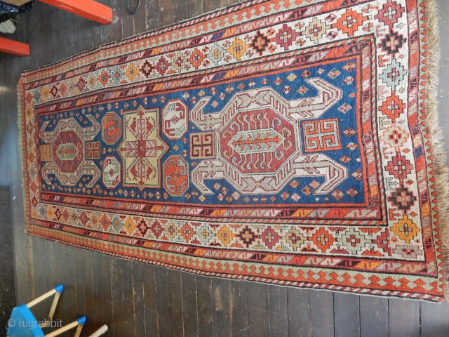 antique kazak - excellent pile - 3 minor sewing repairs - 4 x 8 ft size- both ends secured as shown - needs a good wash