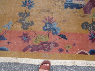 9' x 11' 7" antique chinese art deco rug beautiful colors solid rug has wear as shown no hole little moth at one end designer dream needs cleaning cheap money 395.00 plus shipping . sold thanks