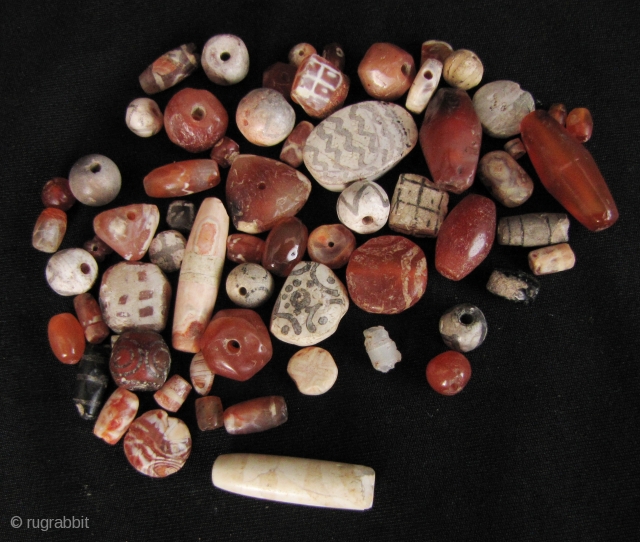 Etched Carnelian Beads: Loose strand lot of mixed etched and faceted beads from what is now Pakistan. i bought these along with a group of Bactrian and Kushan coins so these come from this era (circa about 2000 years old if not more). Total length: 66cm/26in (scale is 1in = 2.5cm). 64 beads in all. Free shipping via Hong Kong Registered Airmail.
